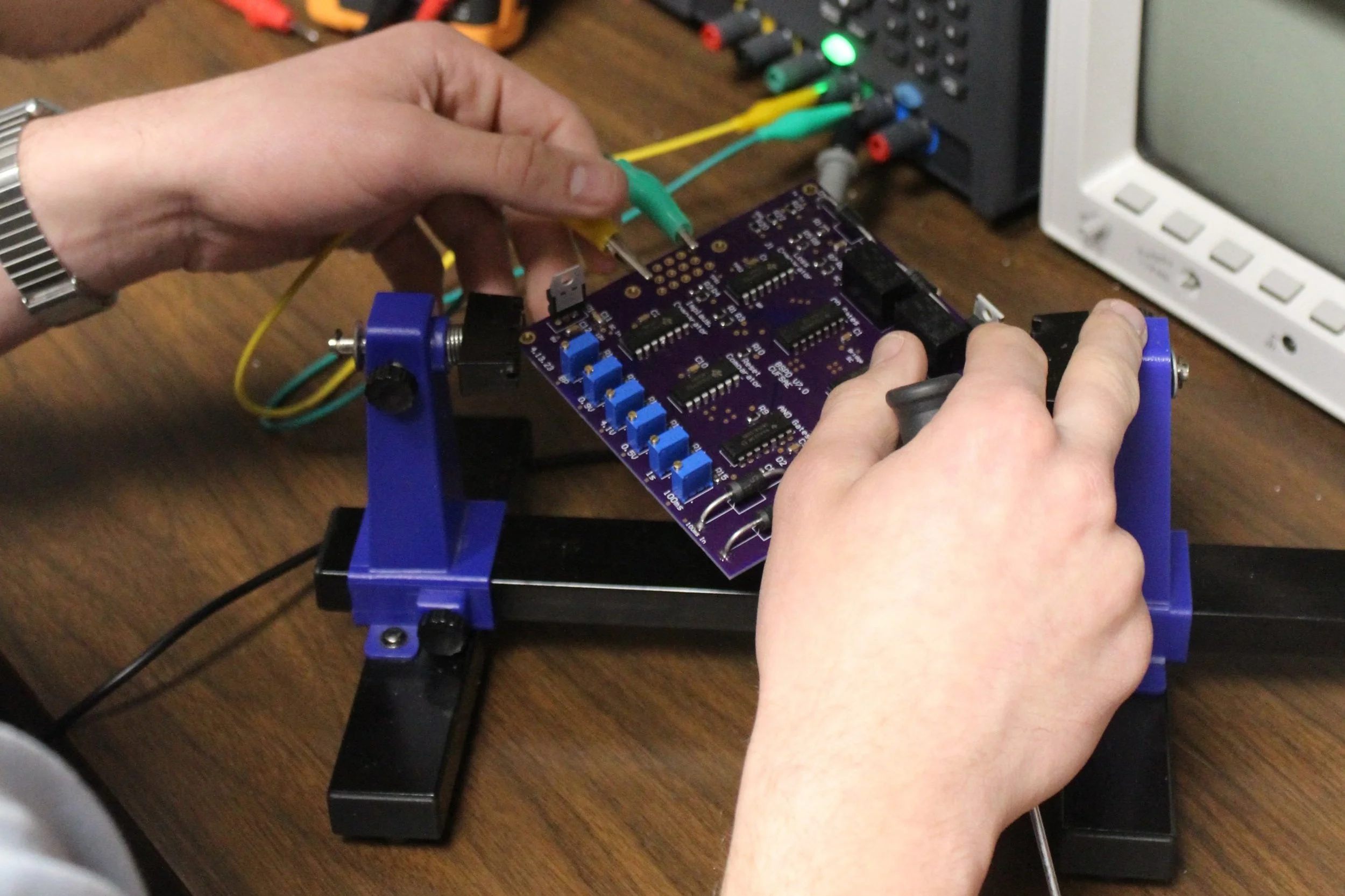 An Electrical Division member testing a student-designed and custom-built PCB using a power supply.